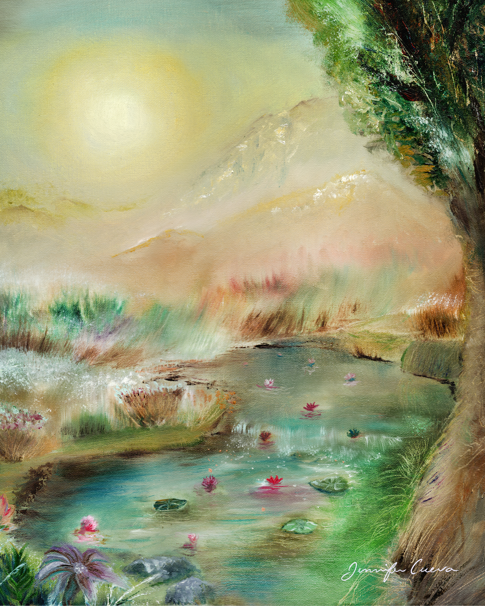 I am Home Again is an artwork by artist Jennifer Cueva which was created to be a visual device for mindfulness by showcasing the soothing natural scenery of a river with waterlilies in the afternoon. It is a reminder that we are all human, and we connect with nature, which is what makes us one.